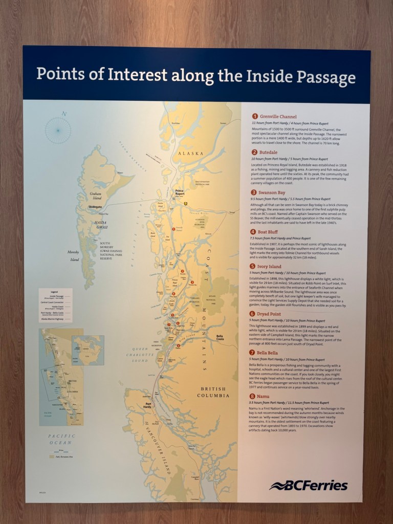 “Inside Passage” ventede på os. En sejltur, der ville vare fra kl. 07.30 til 23.50, og som ville bringe os 500 km gennem beskyttede farvande fra Prince Rupert, kun 30-40 km fra grænsen til Alaska, og ned til Port Hardy, der ligger på Vancouver Islands nordspids.