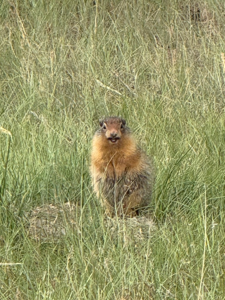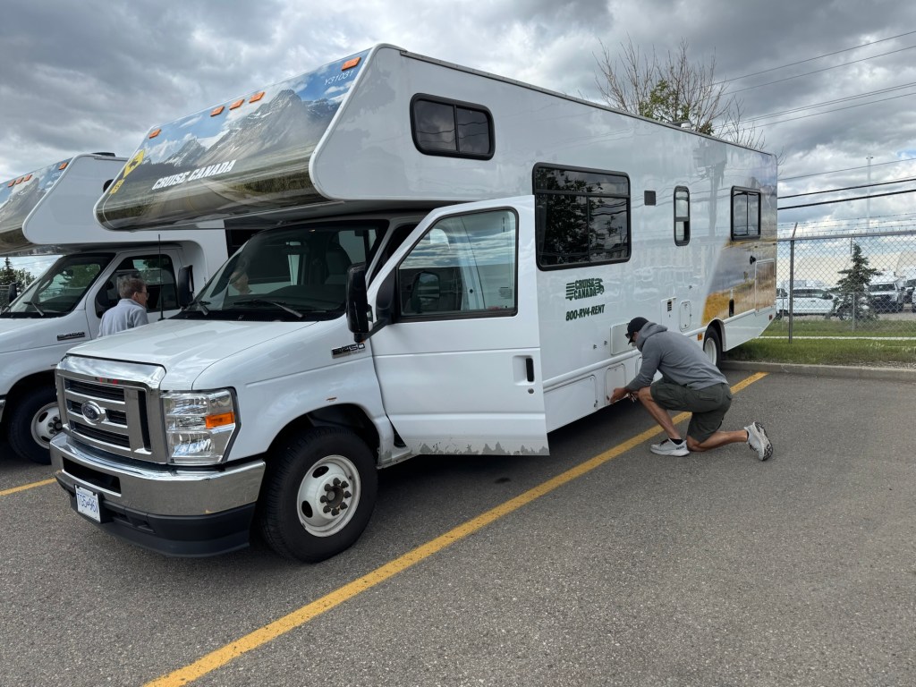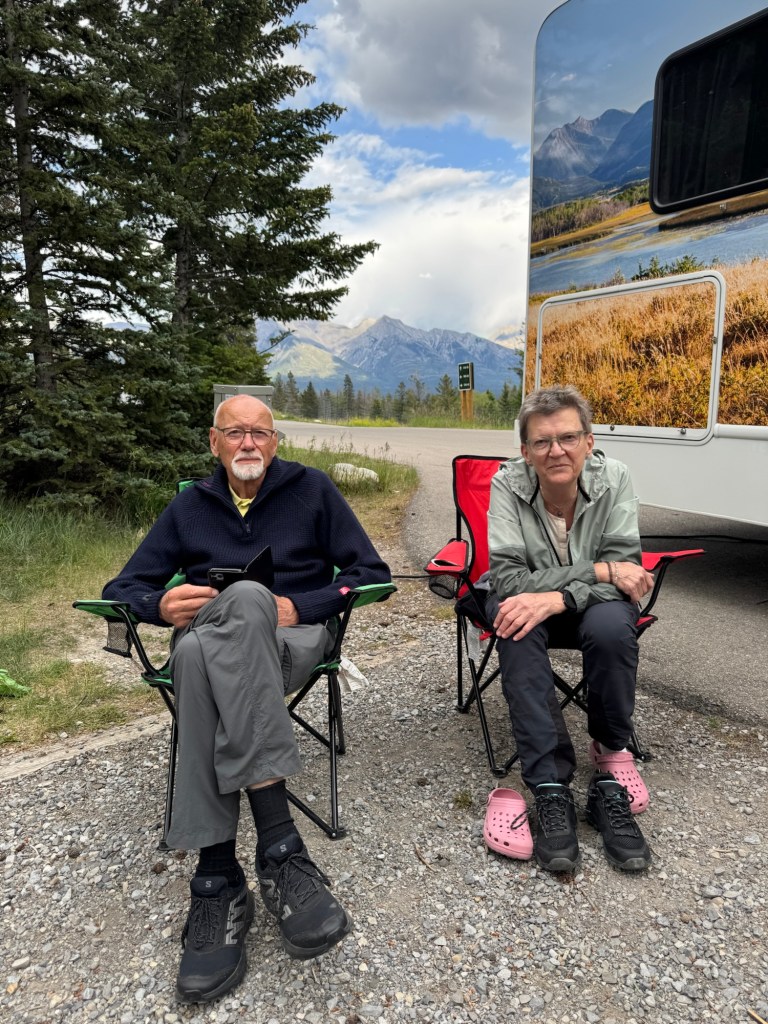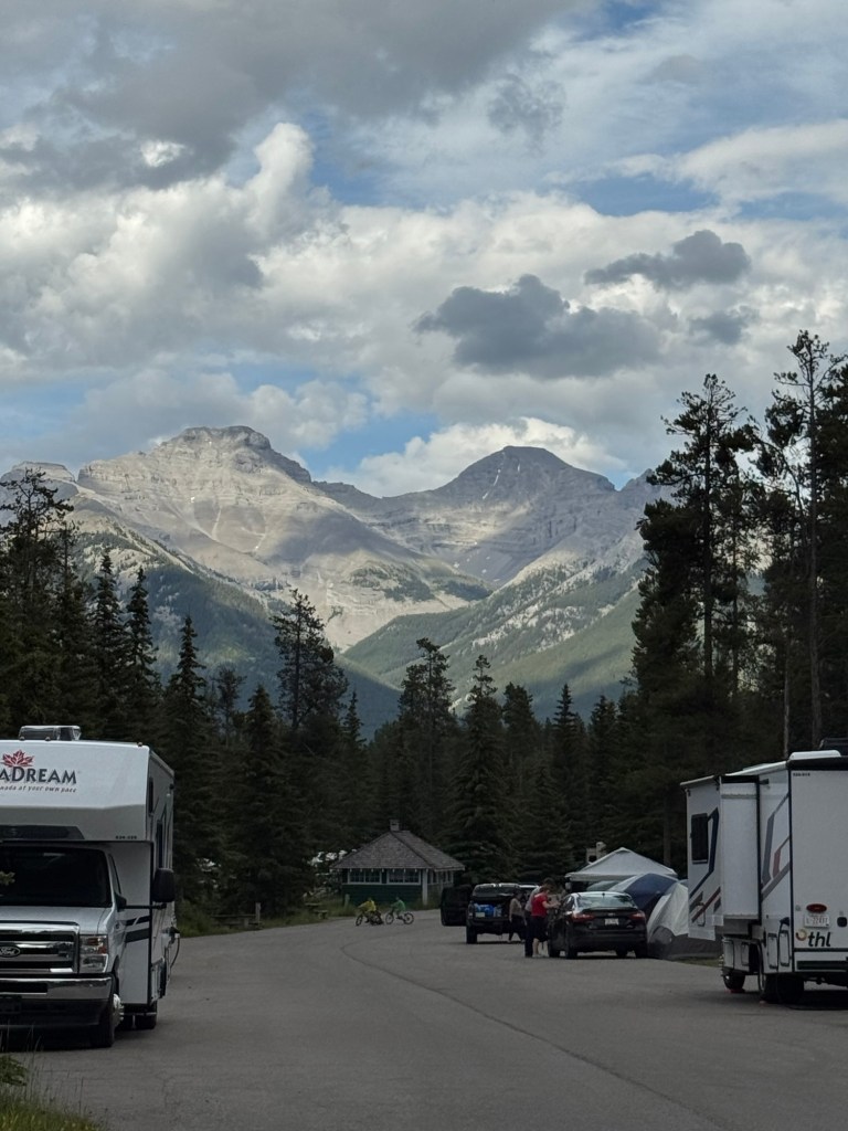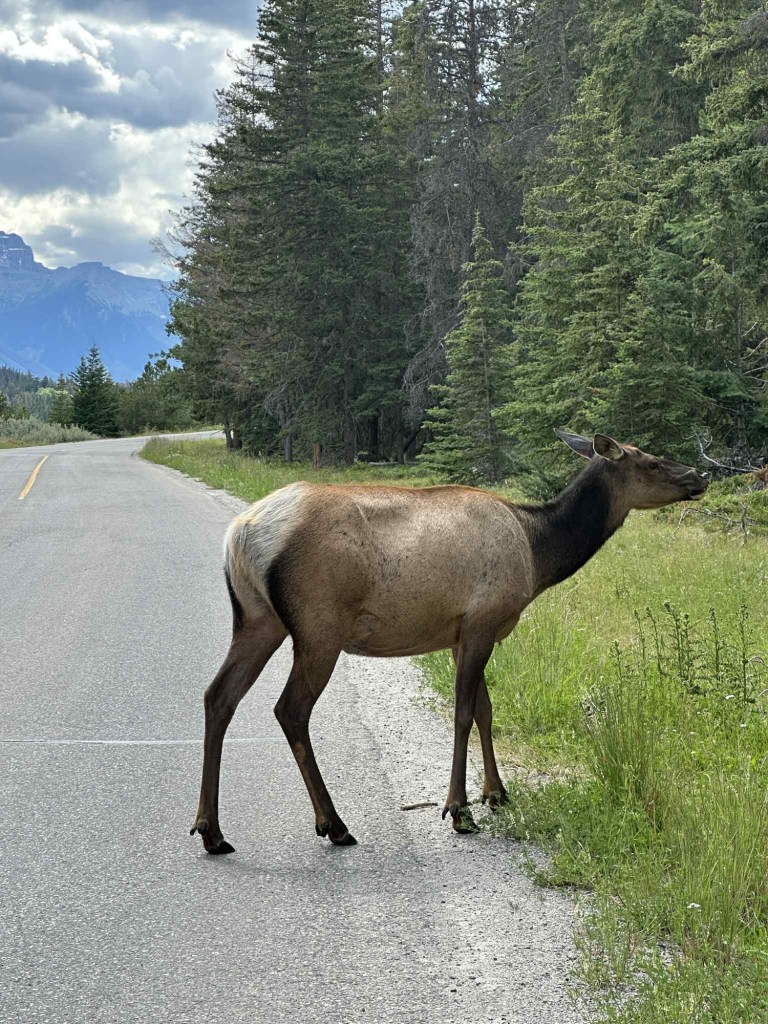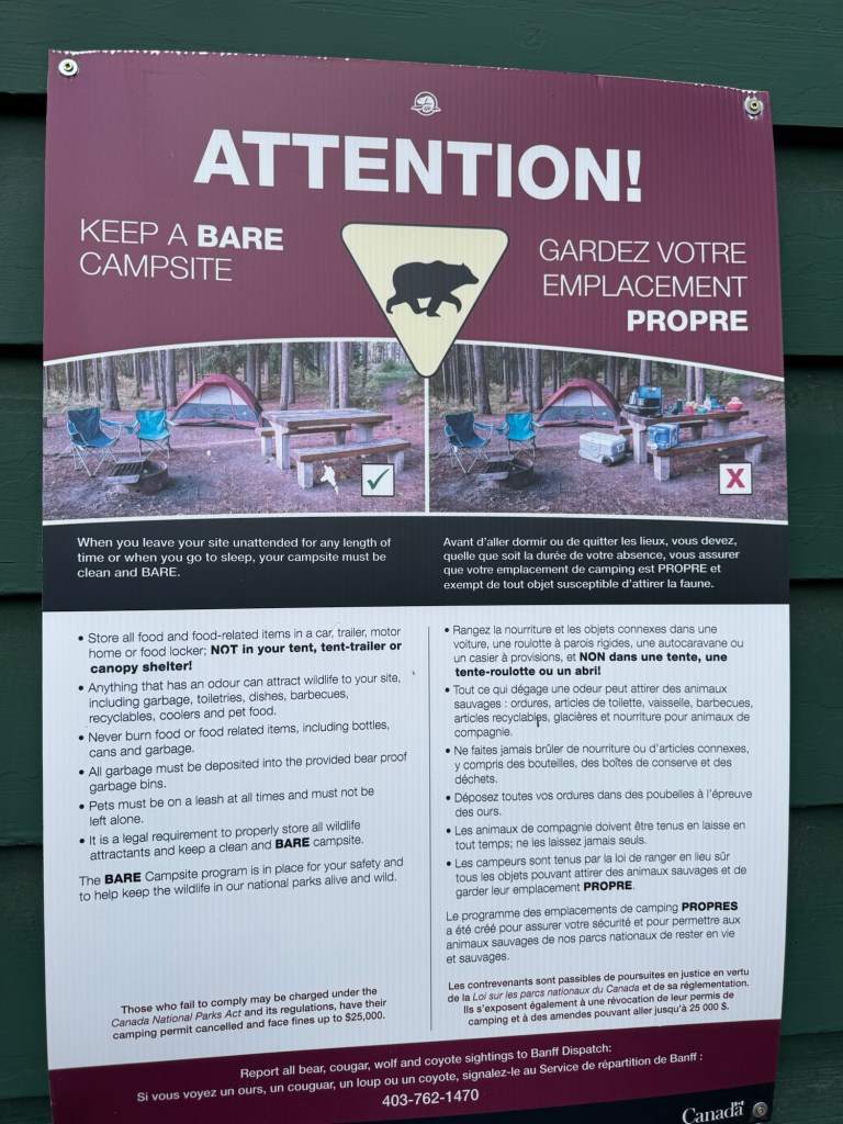 Vi havde været heldige at få plads på “Tunnel Mountain Campground”, og vi havde endda fået en plads med strøm. Pladsen ligger fuldstændigt vidunderskønt – midt i bjerglandskabet. På det sidste stykke dertil var der skilte alle vegne, hvor der stod, at man skulle passe på ‘the wildlife’ på vejene, og det fik vi demonstreret.