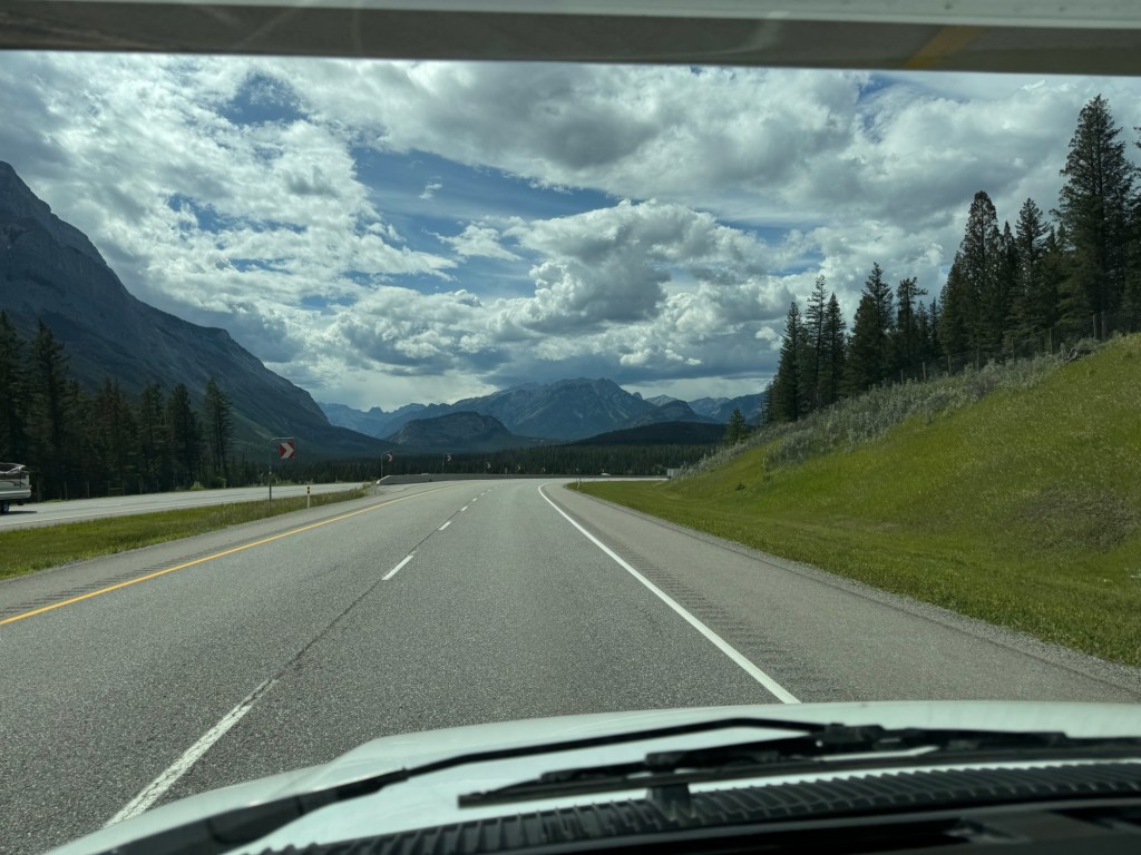 Turen mod Banff var fantastisk med den ene smukke udsigt efter den anden. Da vi var i Calgary, kunne vi ane Rocky Mountains i det fjerne. Nu tårnede de grå bjerge sig op foran os, og vi kunne se sneen på toppene. Vi passerede indkørslen til Banff, hvor der nærmest er en slags paskontrol, hvor man skal dokumentere sit “Park Pass”.