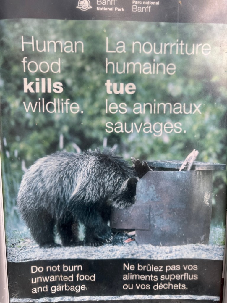 Vi skulle åbne den næste låge i vores Canada-julekalender, og bag den lå Banff Nationalpark. Banff ligger midt i Rocky Mountains, som er bjergkæden, der strækker sig fra New Mexico i syd og hele vejen til den nordligste del af British Columbia i Canada. Banff Nationalpark er kendt for bjergene, ja, men måske endnu mere for dyrelivet. Her er grizzlybjørne, sorte bjørne, elge, ulve, ørne og mange andre dyrearter. Adgangen til parkerne er reguleret, så myndighederne styrer turisterne og deres adfærd. Der er få campingpladser, og det er svært at få plads. Da jeg f.eks. bookede vores campingpladser for et halvt år siden, var der ganske få pladser tilbage, så jeg måtte tage, hvad vi kunne få.